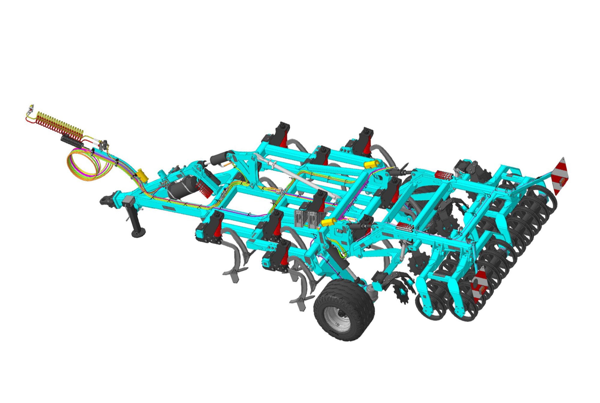 Культиватор снабжен системой стабилизации рамы и копирования рельефа. Блок загортачей и катков исполнен с разнообразными регулировками: высота, угол наклона относительно почвы, угол атаки. Тяжелый тандемный каток за счет самоочистки не забивается на влажных почвах, разрушает комья, производит окончательное обратное уплотнение.