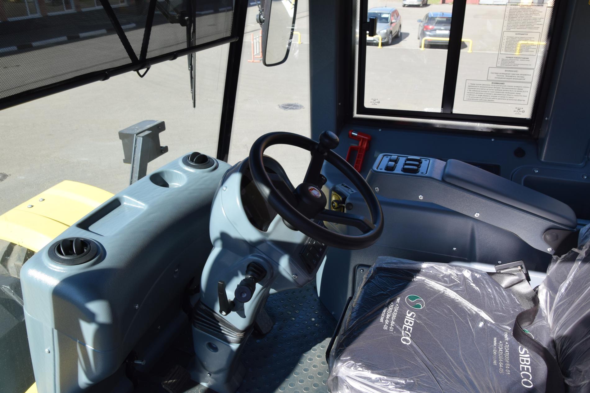 Кабина двухместная с центральным расположением сиденья водителя, встроенным каркасом безопасности, защищающим оператора от опрокидывании машины (ROPS) и от падающих предметов (FOPS). Гидрообъемное управление поворотом, регулируемая рулевая колонка. Удобное расположение органов управления, подрессоренное сиденье водителя, тонированные стекла.